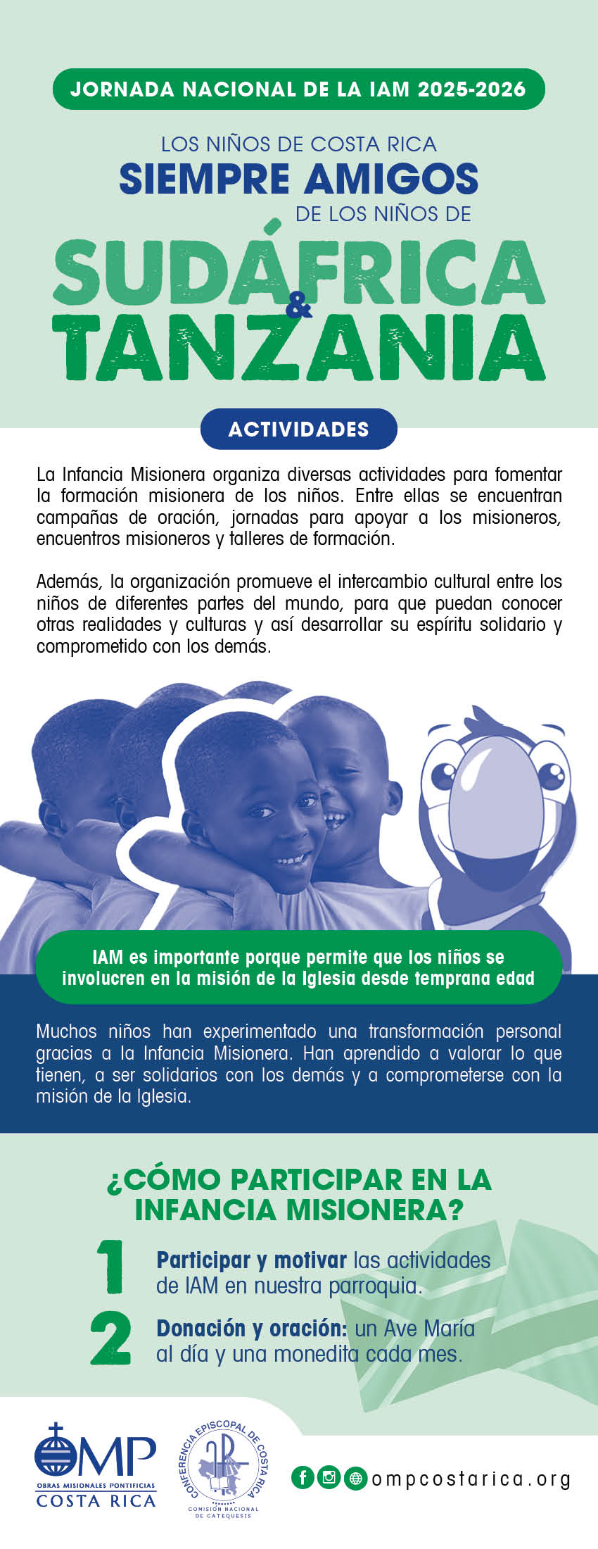 Infancia y Adolescencia Misionera es una Obra del Papa, que promueve la ayuda recíproca entre los niños de todo el mundo. En esta obra los niños ejercen como pequeños misioneros y son protagonistas de la Evangelización. Infancia Misionera da a los niños un papel protagonista en el servicio misionero: ellos son los agentes, donantes y receptores de la tarea misionera.